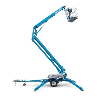 The Genie TZ50 towable aerial lift provides safe, stable access for elevated work such as tree trimming, building maintenance, and exterior repairs. Its towable design makes it easy to transport to job sites without specialized hauling equipment.
